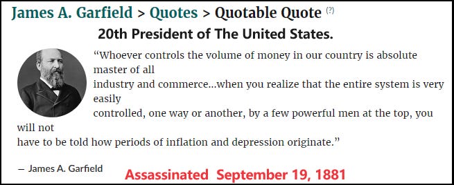 'Whomever Controls The Volume of Money In Our Country, Is The Absolute Master of All." James A. Garfield- Assassinated U.S. President.
